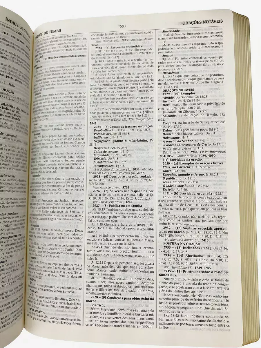 B’blia de Estudo Thompson A B’blia de Estudo Thompson na vers‹o AEC (Almeida Edi‹o Contempor‰nea), Ž considerada est‡ entre os maiores cl‡ssicos considerada pelos leitores da B’blia no Brasil, pois essa tradu‹o n‹o perde em nada a essncia da palavra de Deus. S‹o aproximadamente 100 mil referncias por assunto, sendo: mais de 7000 nomes, temas e lugares. Praticamente uma enciclopŽdia b’blica, a B’blia de Estudo Thompson conta ainda com: Concord‰ncia b’blica, muitos mapas, um rico suplemento arqueol—gico e geol—gico que se identifica como o melhor dentre as b’blias de estudo, biografia de personagens, estudos b’blicos com muitas ilustra›es, devocionais e uma detalhada an‡lise de cada livro da B’blia, com contexto hist—rico, cronologia, tema principal e outros pontos de interesse especial. Somente conhecendo a B’blia Thompson voc poder‡ descobrir por que ela Ž uma unanimidade entre os apaixonados pela Palavra de Deus. Principais Caracter’sticas da B’blia Thompson: Ð Referncia em cadeia: S‹o mais de 7 000 nomes, lugares e temas, totalizando mais de 100 mil referncias por assunto; Ð An‡lise detalhado de cada livro: S‹o destacados a autoria, o tema principal, a ocasi‹o hist—rica e outros pontos de cada assunto; Ð Suplemento Arqueol—gico: Quase 80 p‡ginas ilustradas sobre as evidncias cient’ficas que comprovam os fatos relatados nas Escrituras; Ð Concord‰ncia: Mais de 35.000 verbetes da B’blia, que o ajudar‹o a localizar rapidamente os textos que trazem o assunto; Ð Biografia de personagens: Uma an‡lise dos principais personagens da b’blia e os principais acontecimentos relacionados a eles s‹o objetos de estudo; Ð Devocionais: S‹o mais de 100 diferentes temas que voc poder‡ utiliz‡-los em seu momento devocional ou grupo de estudo; Ð Mapas: 16 p‡ginas de mapas b’blicos preto e branco para aprender melhor alguns temas da Palavra; Ð Estudos Ilustrados: S‹o diversos estudos b’blicos ilustrados, com v‡rios gr‡ficos que o ajudar‹o a compreender melhor a B’blia; Ð Profecias: Conhea diversas profecias e as datas em que foram cumpridas na Hist—ria.Ê