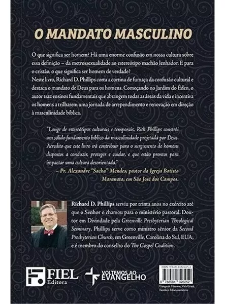 "Longe de estereótipos culturais e temporais, Rick Phillips constrói um sólido fundamento bíblico da masculinidade projetada por Deus. Acredito que este livro irá contribuir para o surgimento de homens dispostos a conduzir, proteger e cuidar, e que estão prontos para impactar uma cultura desorientada." - Pr. Alexandre “Sacha” Mendes, pastor da Igreja Batista Maranata, em São José dos Campos.