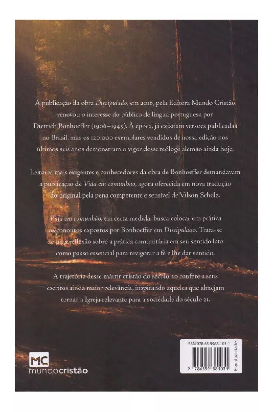 A publicação da obra Discipulado, em 2016, pela Editora Mundo Cristão renovou o interesse do público de língua portuguesa por Dietrich Bonhoeffer (1906–1945). À época, já existiam versões publicadas no Brasil, mas os 120.000 exemplares vendidos de nossa edição nos últimos seis anos demonstram o vigor desse teólogo alemão ainda hoje. Leitores mais exigentes e conhecedores da obra de Bonhoeffer demandavam a publicação de Vida em comunhão, agora oferecida em nova tradução do original pela pena competente e sensível de Vilson Scholz.